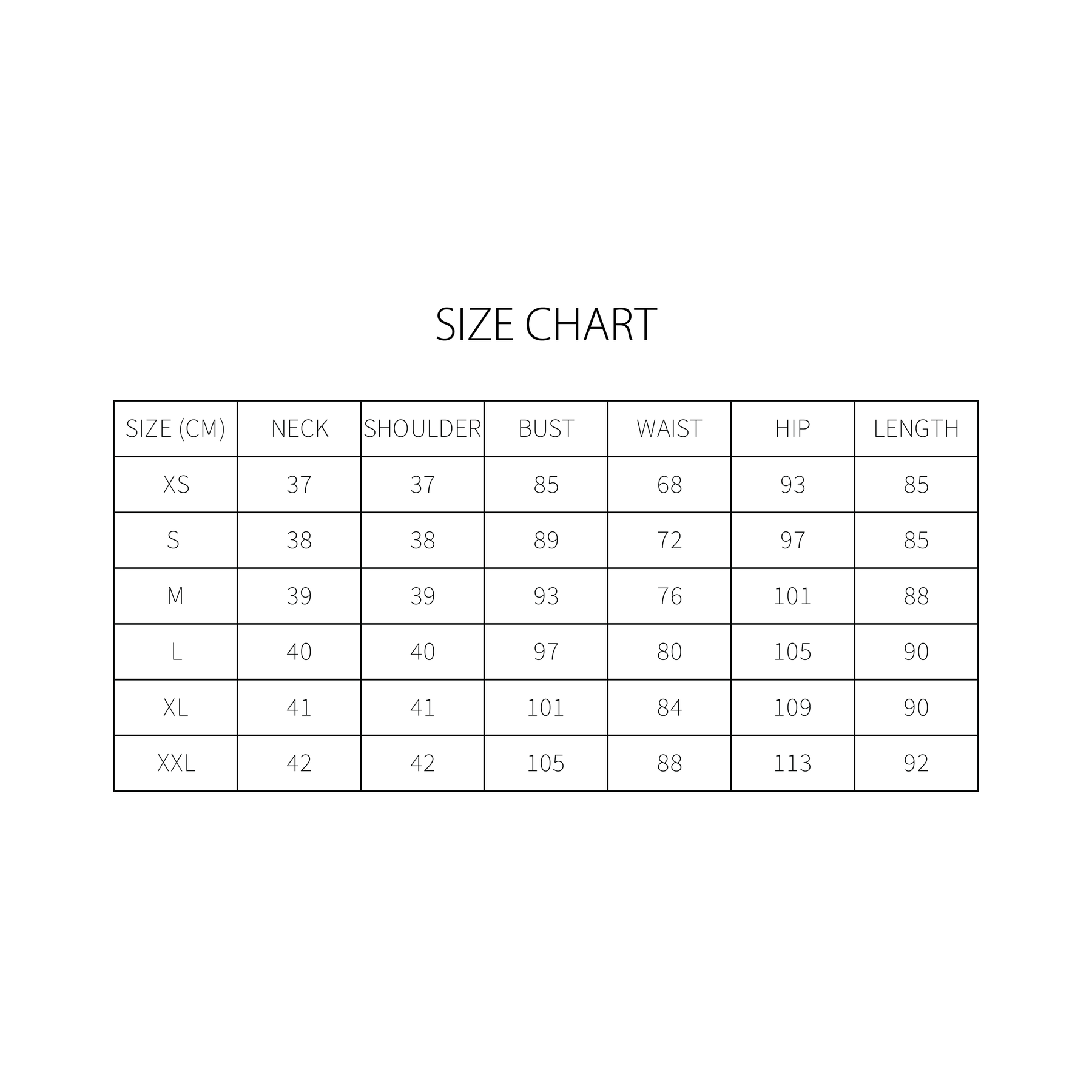 As each garment is made purposefully by hand, difference in measurements of bust, waist and hip may range from 1-3 cm.