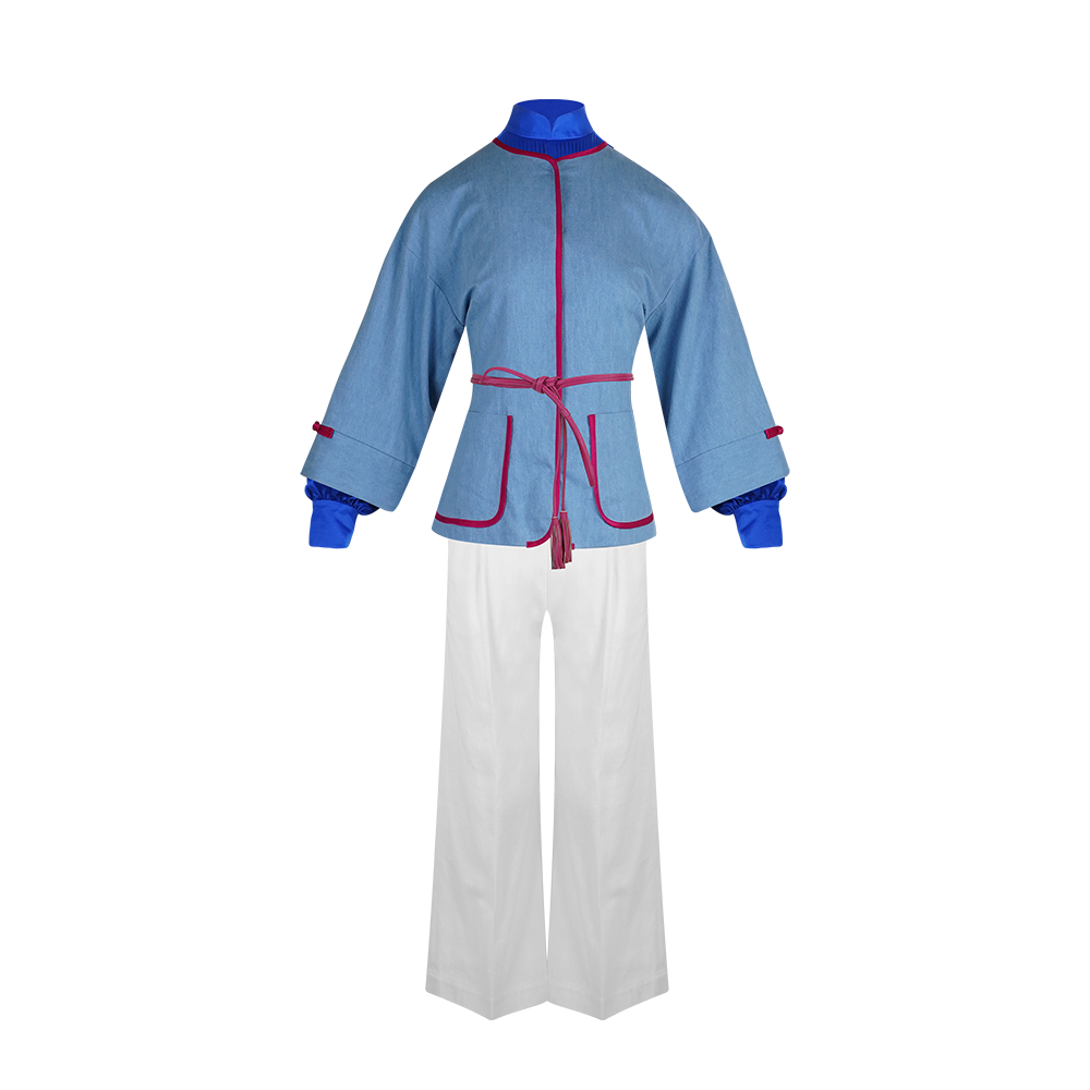 This three piece ensemble reminds us of the toy soldier in the Classic ballet “Nutcracker”. Royal blue 100% silk blouse with a Mandarin collar and pleated front is beautiful worn alone or under this washed indigo denim jacket with fuchsia leather trimmings. Pair it with white denim wide leg pants and a fuchsia leather tassel belt for a military look, or wear them separately for everyday versatility.