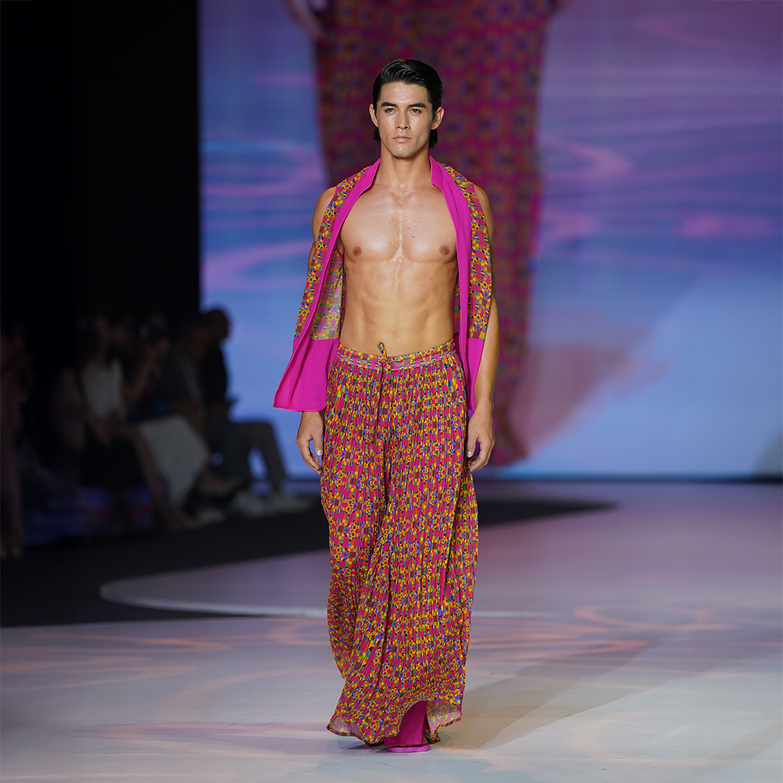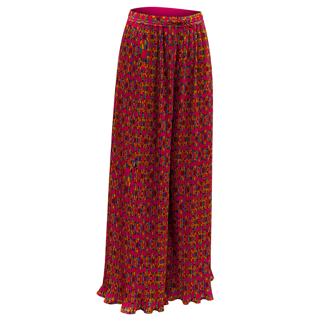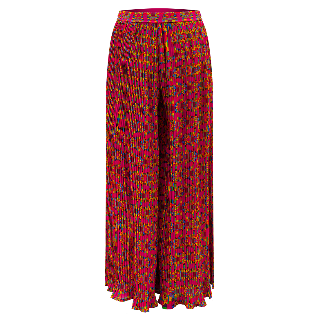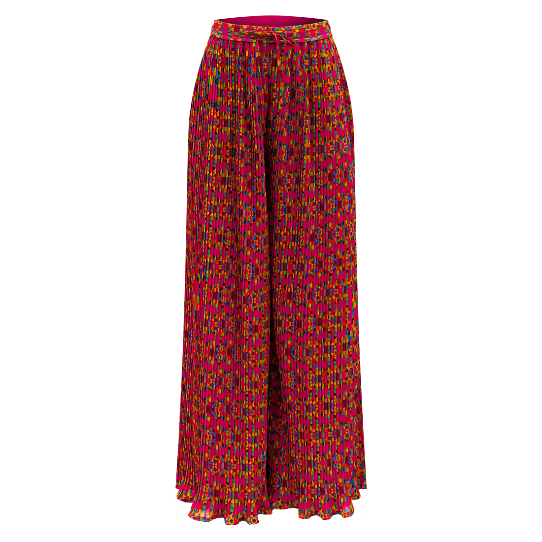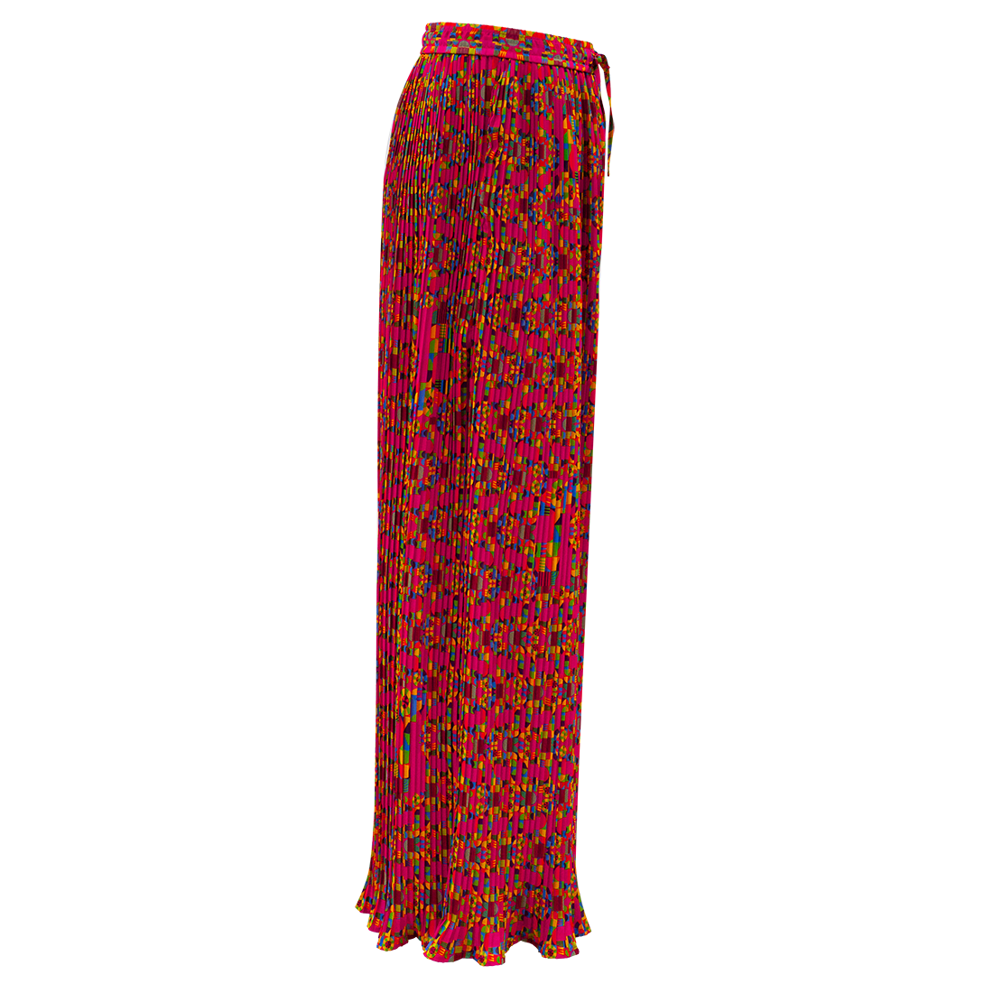 Pleated modern kung-fu pants in printed chiffon; the loose fit is ultra-comfortable, perfect for weekend shopping or vacationing in the French Riviera.