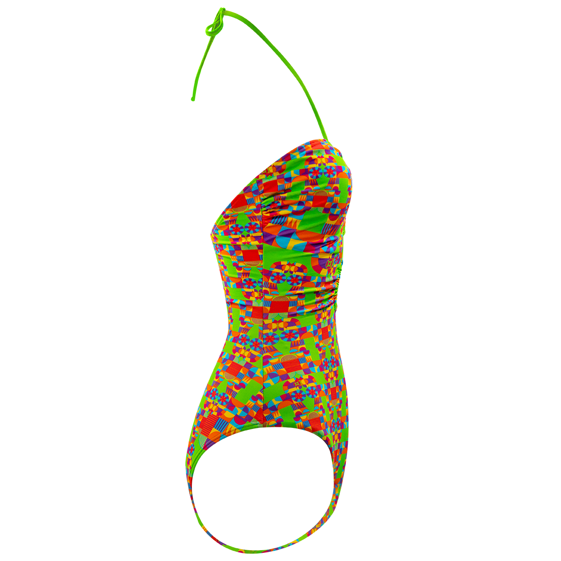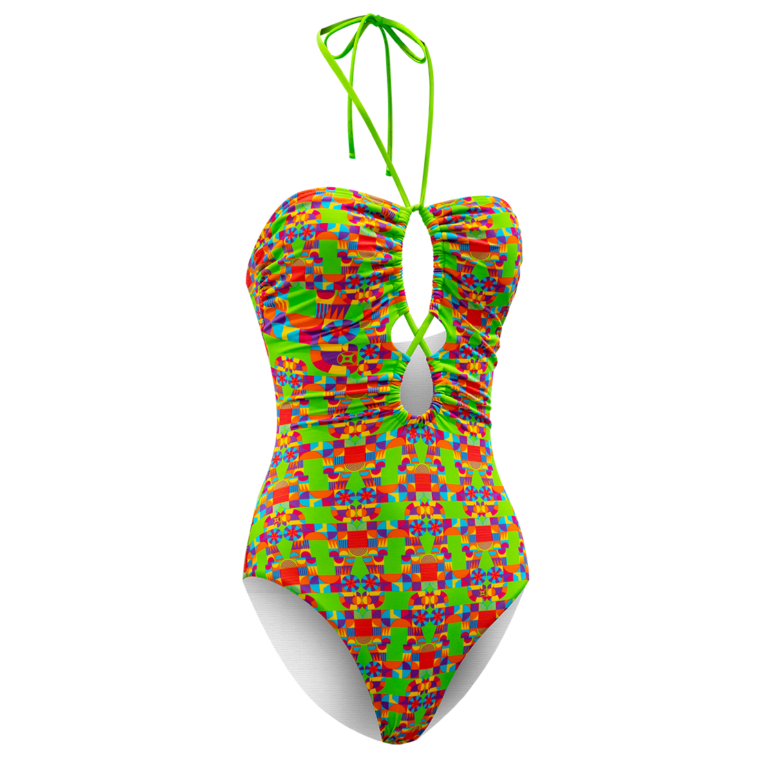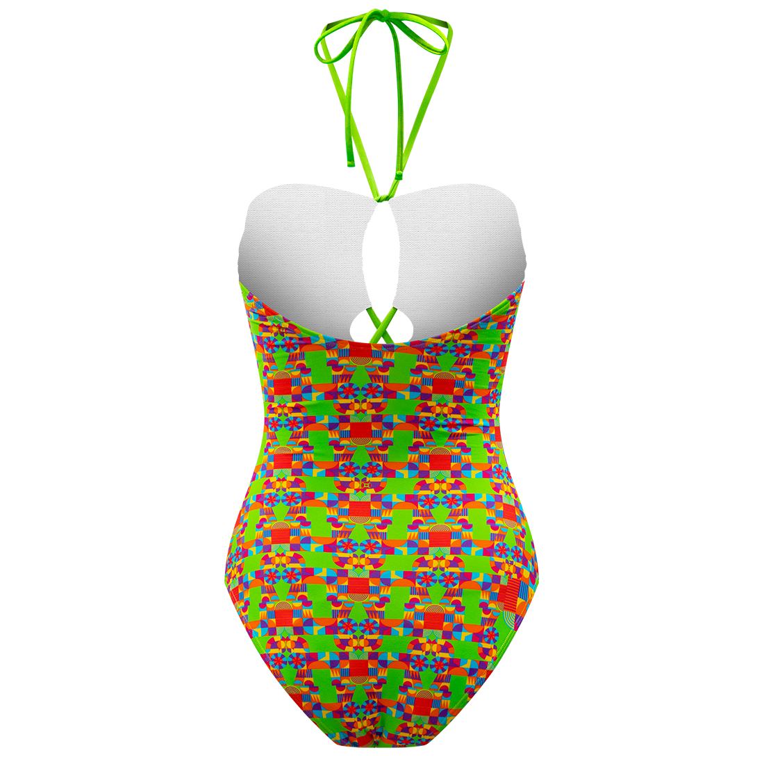 A kaleidoscopic vision of the playful stallion against a lime-green background, this lace-up backless swimsuit is modest and sexy at the same time.