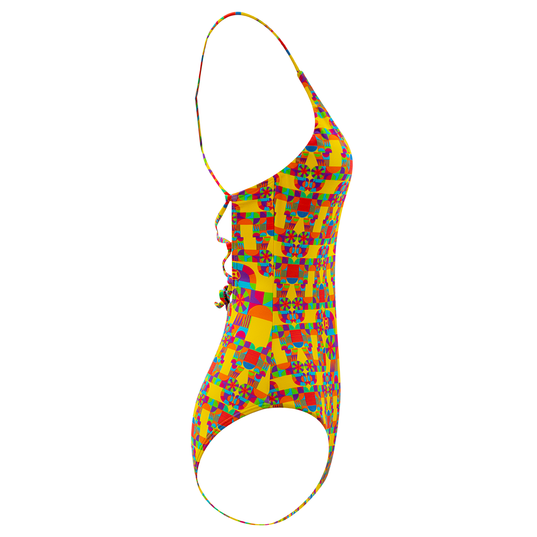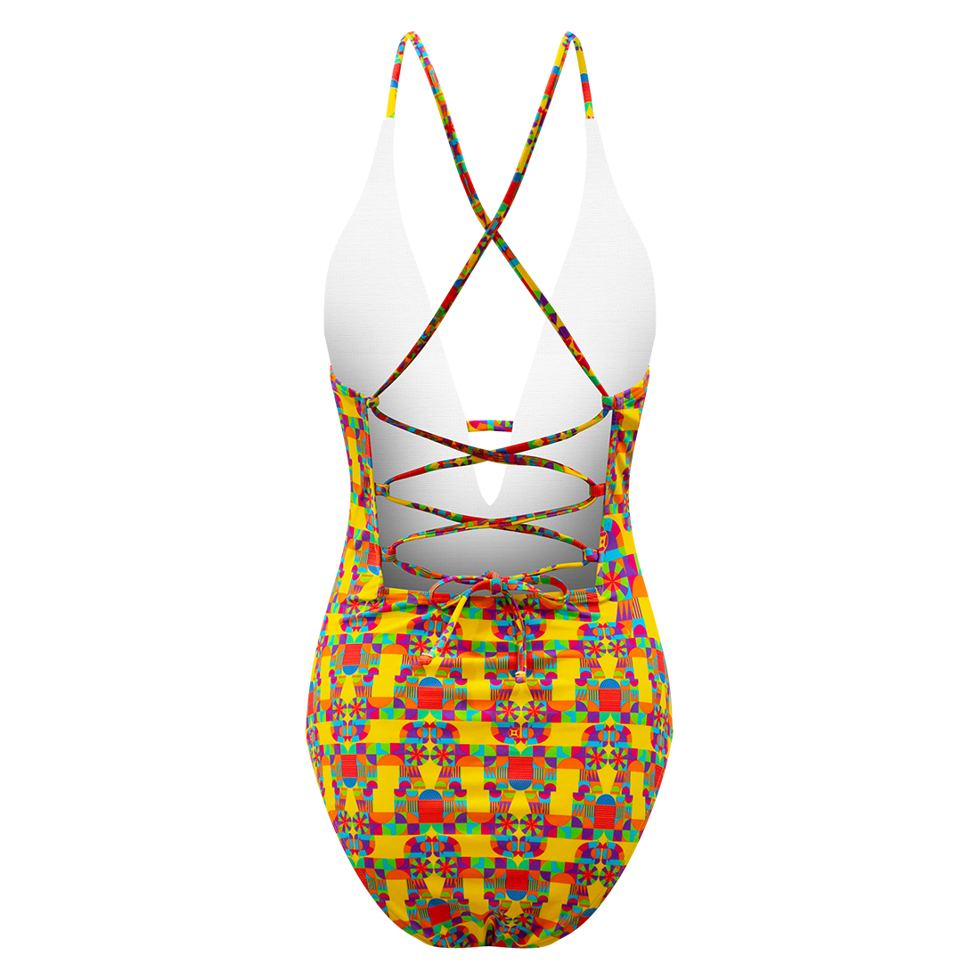 Sunny yellow V-neck swimsuit with a centerpiece stallion prancing alongside a kaleidoscopic herd of stallions.