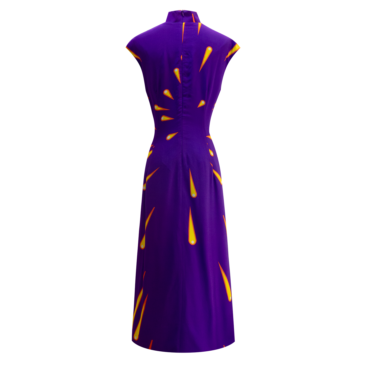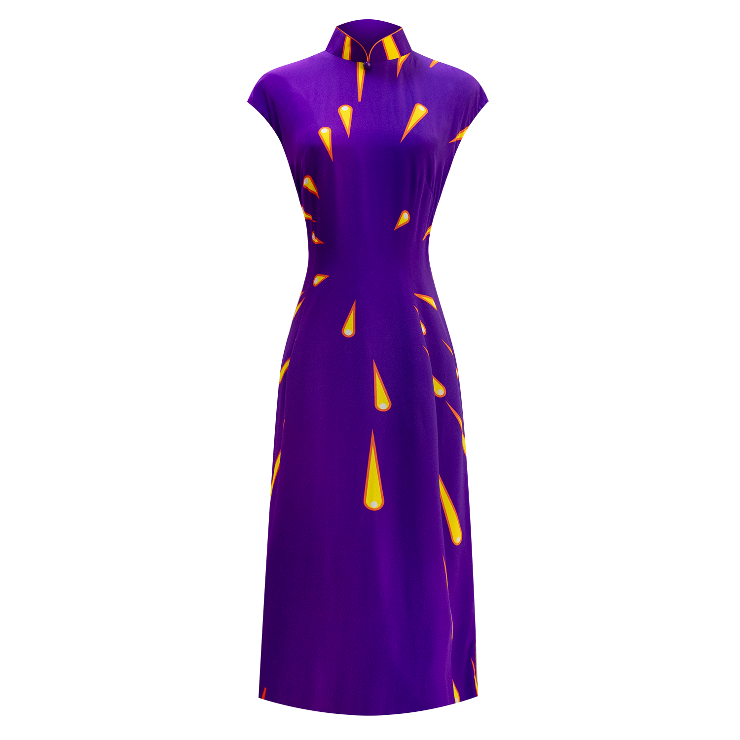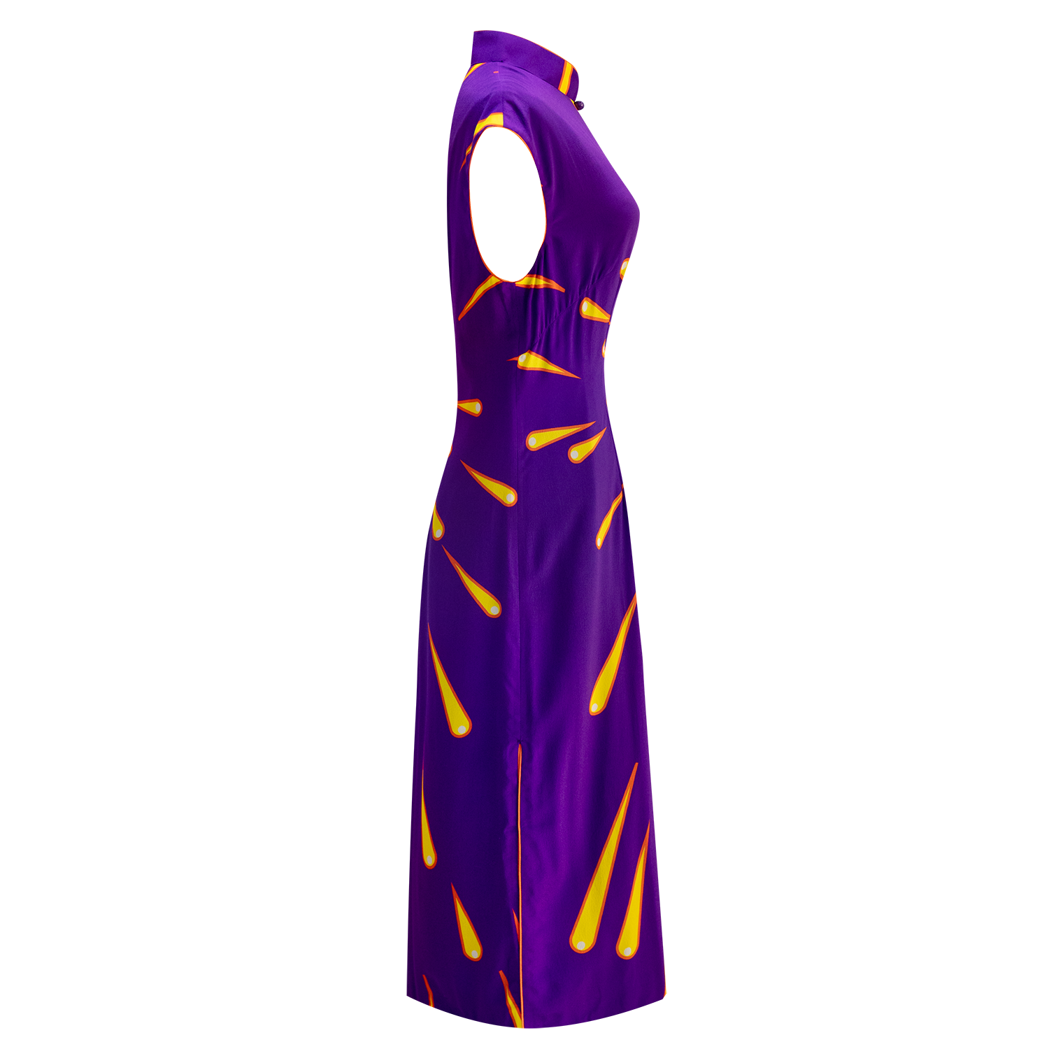 A striking purple cheongsam with of yellow meteor pattern and sparkling crystals mimic the natural wonder of a meteorite. Wittily adorned with a pair of matching meteor flower buttons to complete the effect.