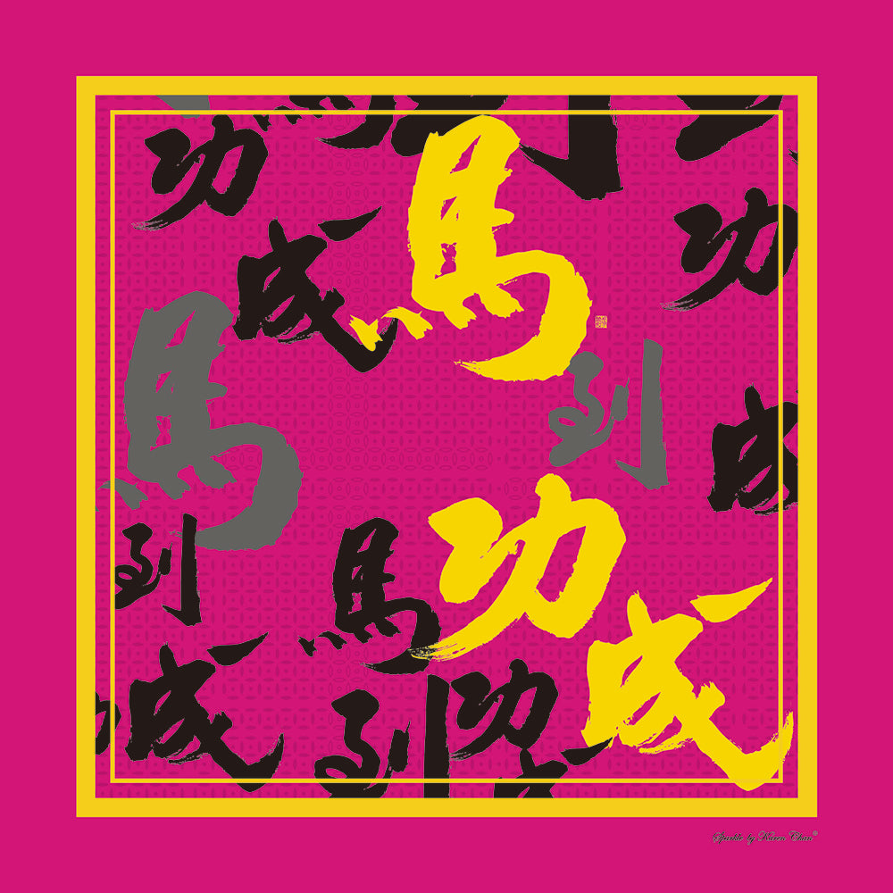 The spectacular calligraphy on this fabric pattern is done by the chairman of HK Calligraphy Association Master Michael Fung exclusively for our brand, and plays on the popular Chinese lucky phrase “The Horse has arrived, and the deed is successful馬到功成”. The name of the piece “Racing Success” plays on the image of the racehorse succeeding first at the winning post.