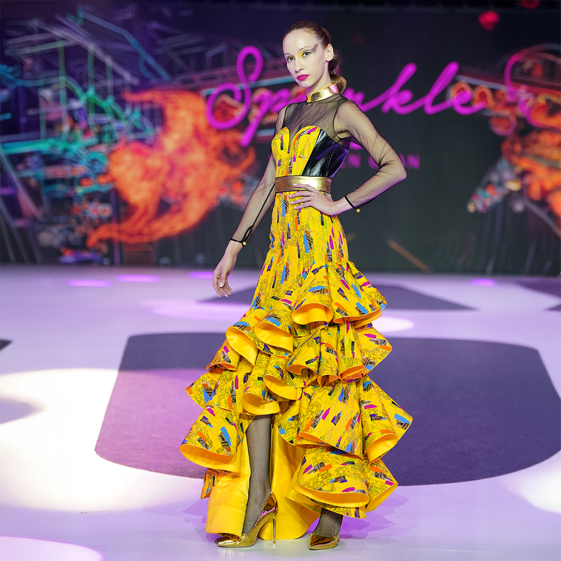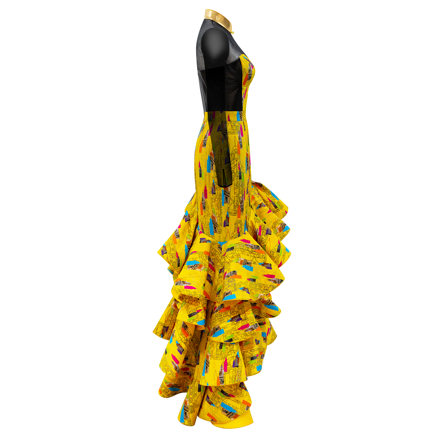 Pure silk cheongsam party dress with a sweetheart-neckline fitted bodice in our original【CLOCK TOWER】print, with side trims in black lambskin leather. Brand signature mandarin collar in metallic gold lambskin leather is held together with the bodice by black illusion mesh front and sleeves. The floor-length skirt silhouette is inspired by the flamenco dancing dress, with gorgeous ruffles in our original【CLOCK TOWER】print and lined in yellow taffeta for structure and luxury.