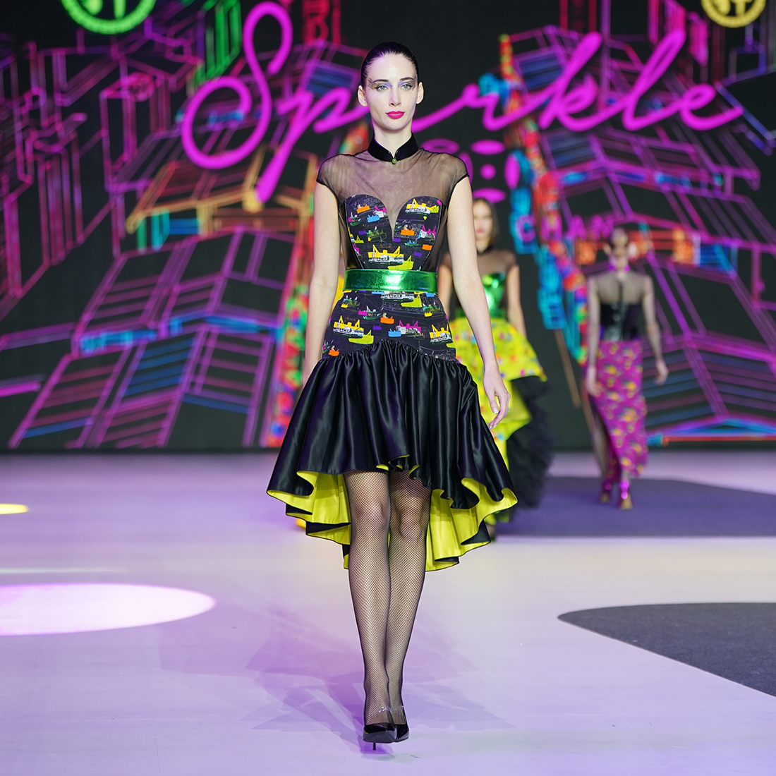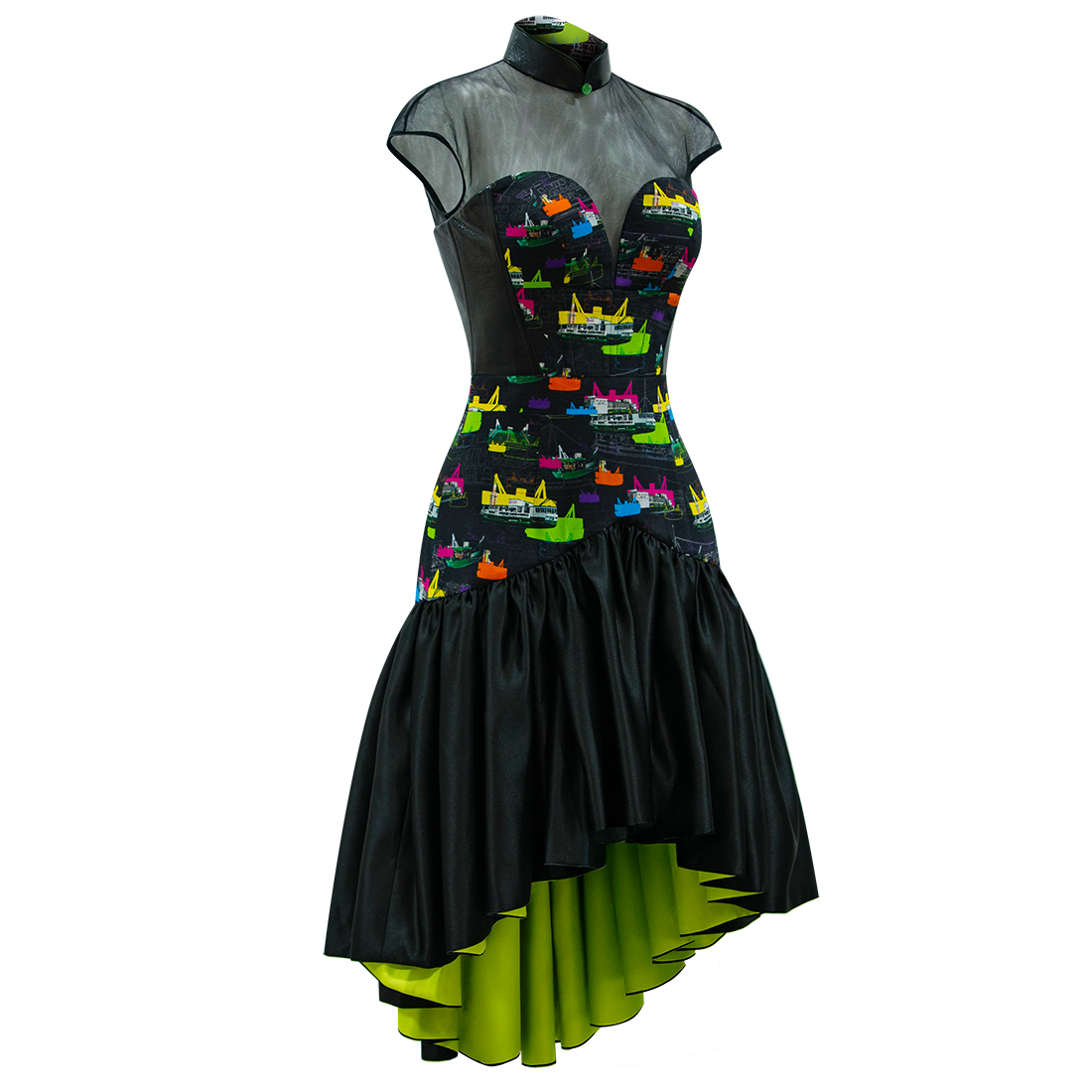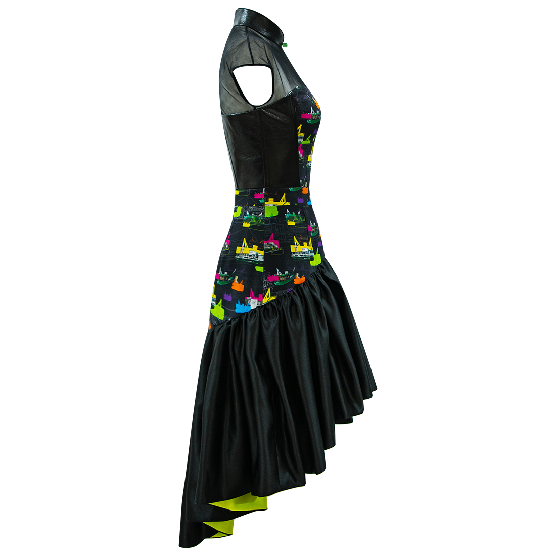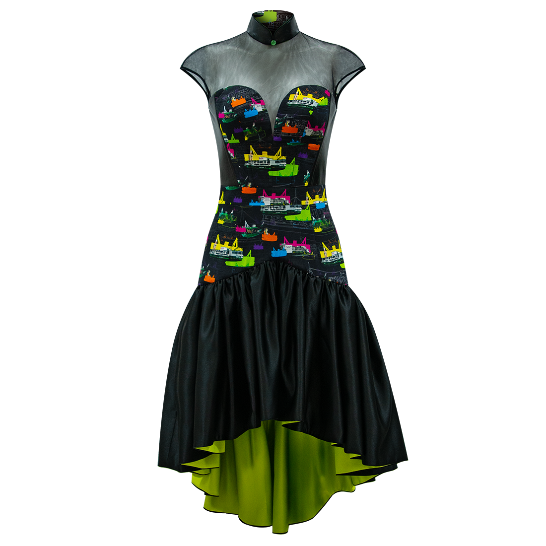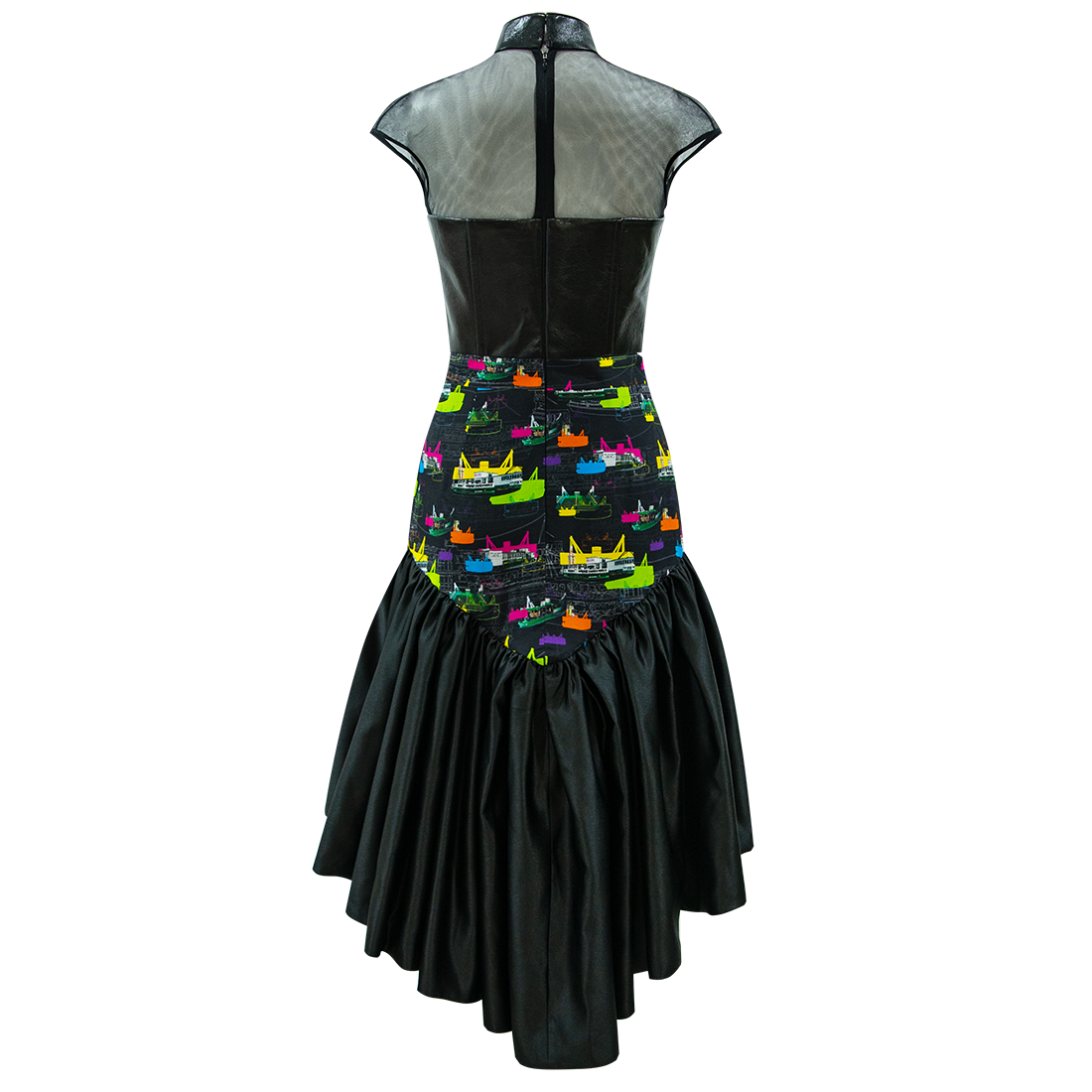 The quintessential little black dress with a funky qipao twist. Silk bodice with sweetheart neckline in 【FERRY PIER】pattern, with brand signature mandarin collar, side trim and back in black lambskin leather, held together by Illusion mesh shoulders and dainty cap sleeves. The organza flouncy hem wrapped in silk is inspired by the ever elegant ballerina tutu.