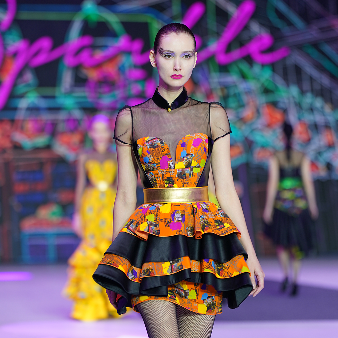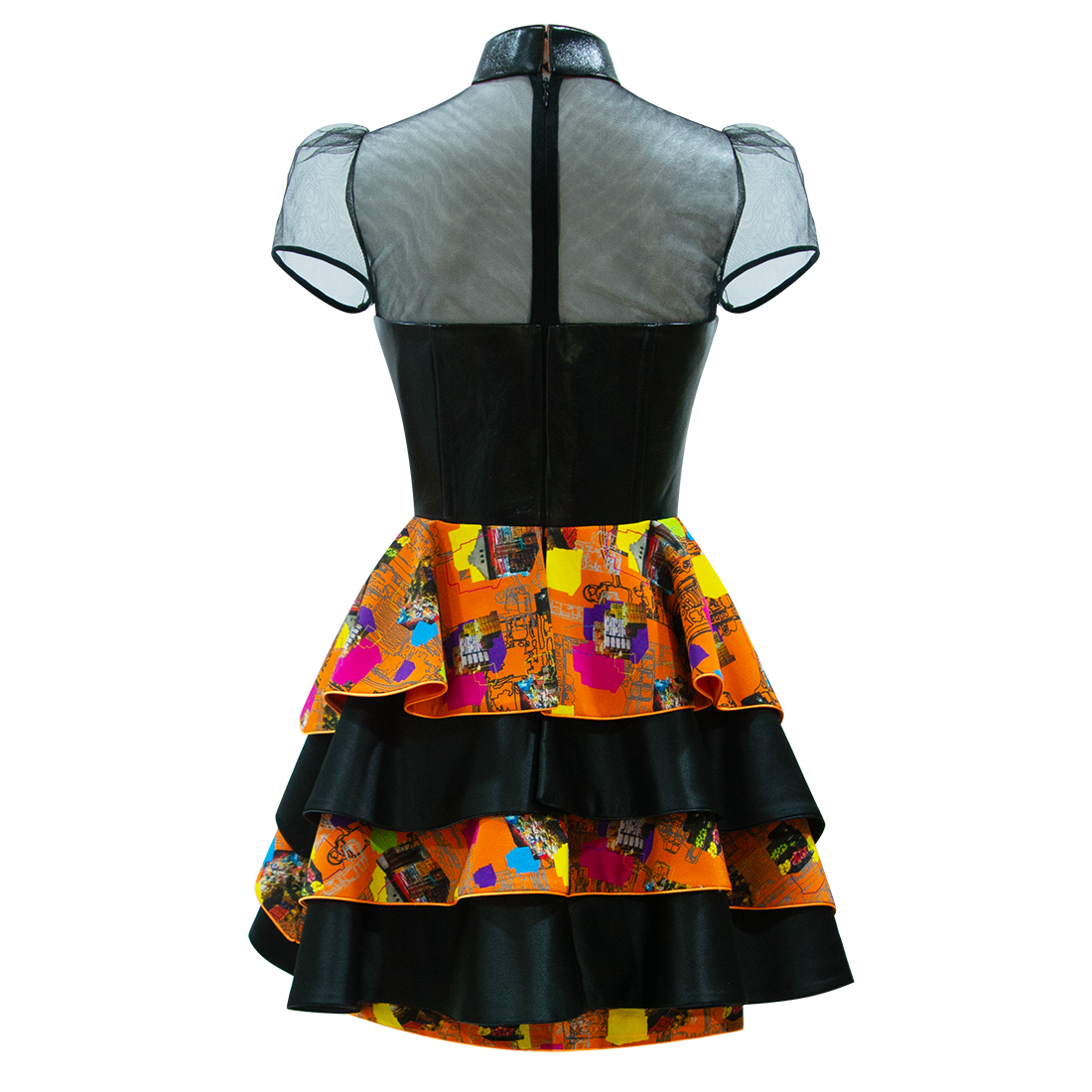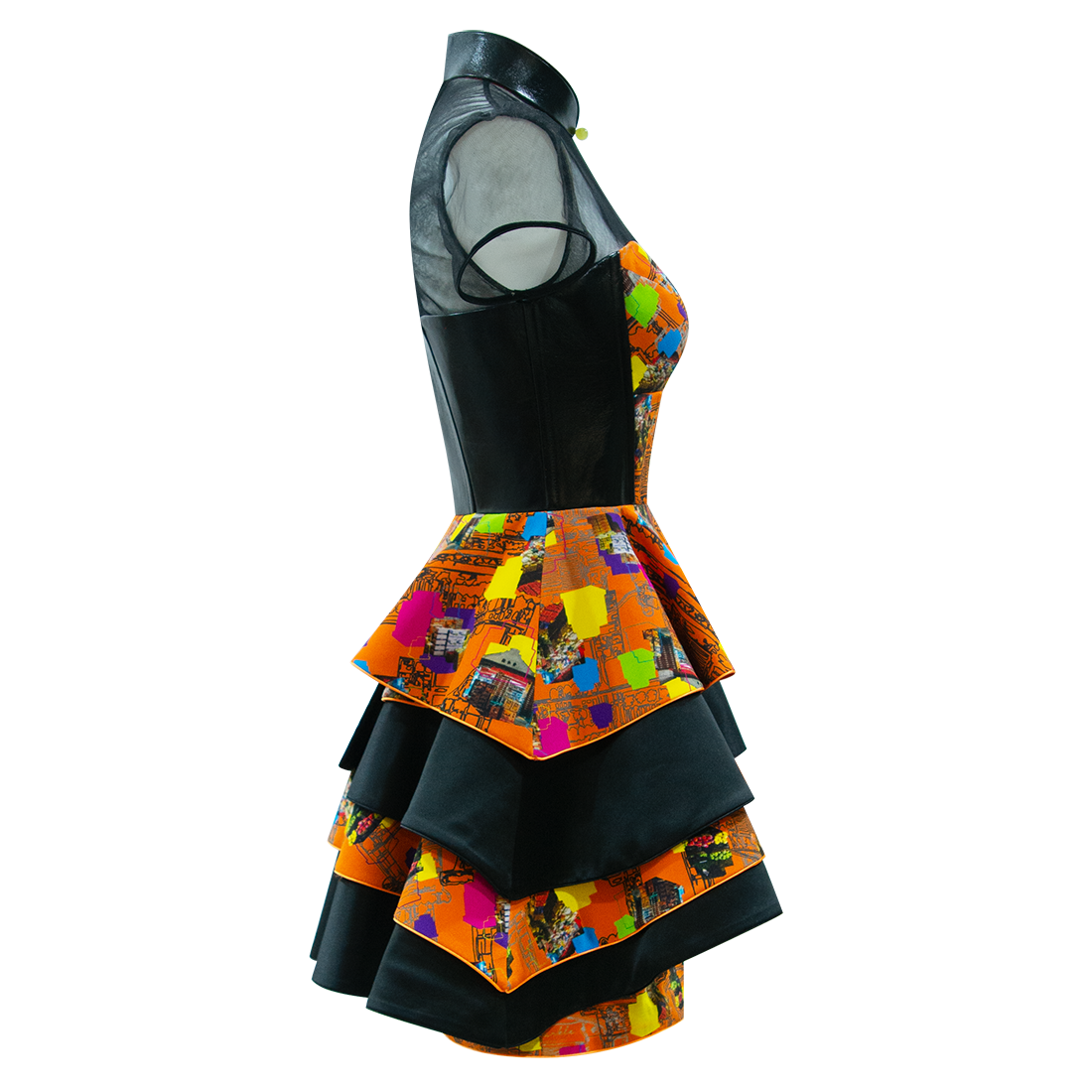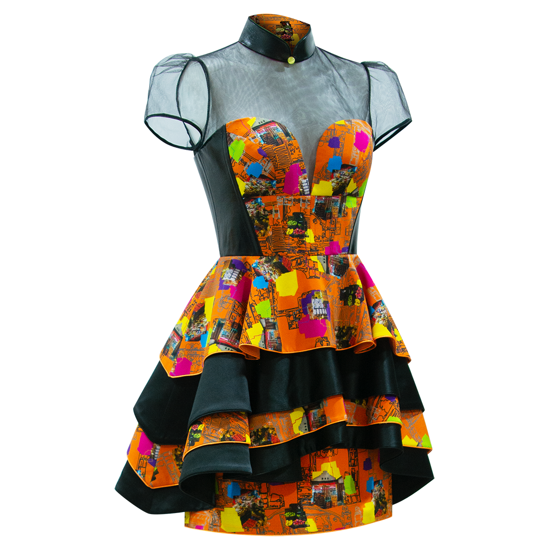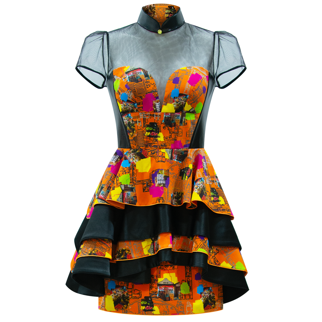This short flouncy cheongsam party dress is young and playful. Silk bodice in【FRUIT MARKET】pattern with sweetheart neckline is framed with black lambskin leather at the waistline and back, with a jewel-like gold lambskin mandarin collar held up by black illusion mesh. The skirt in alternate layers of 【FRUIT MARKET】silk and black taffeta add extra dimension and details to the piece.