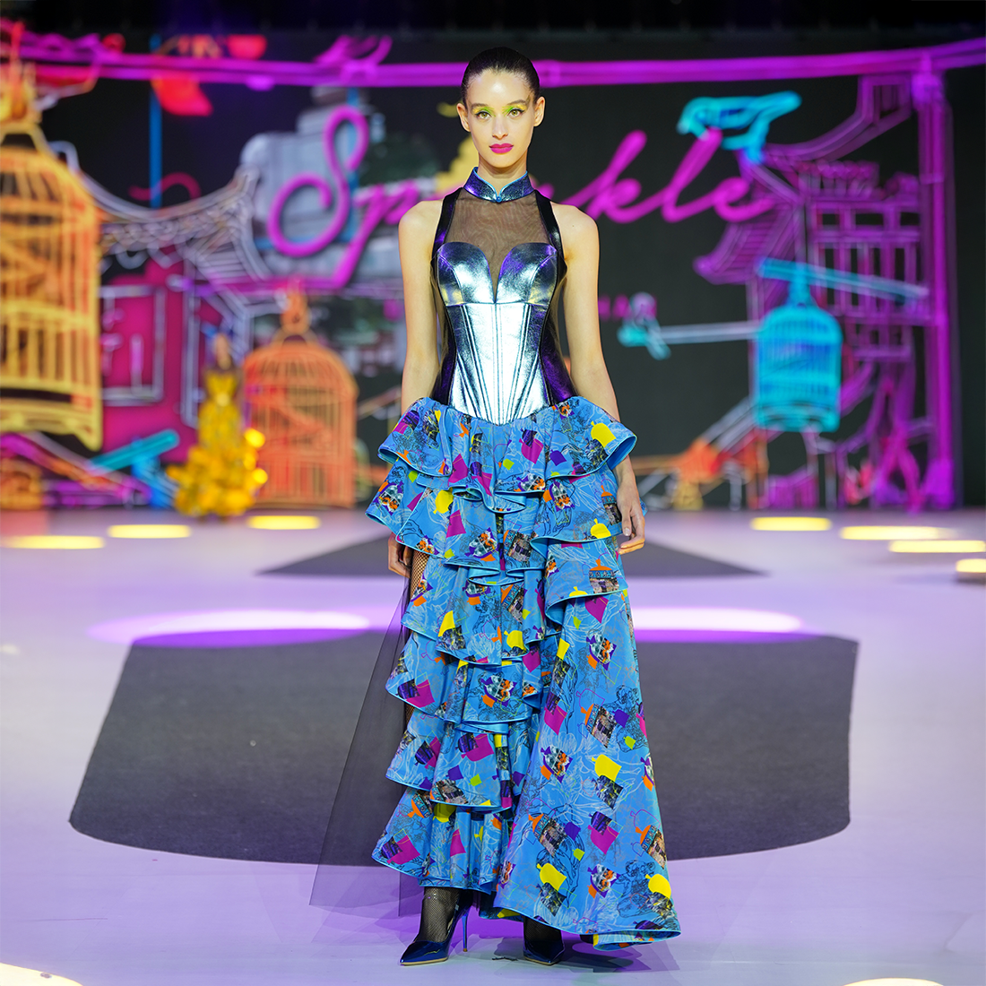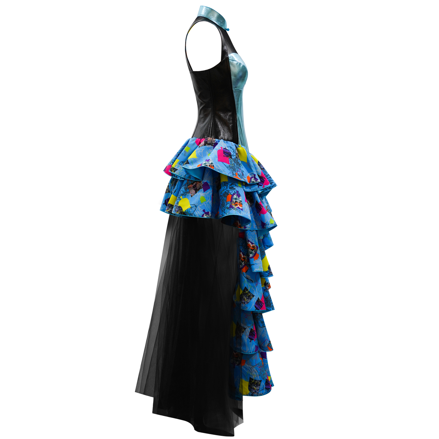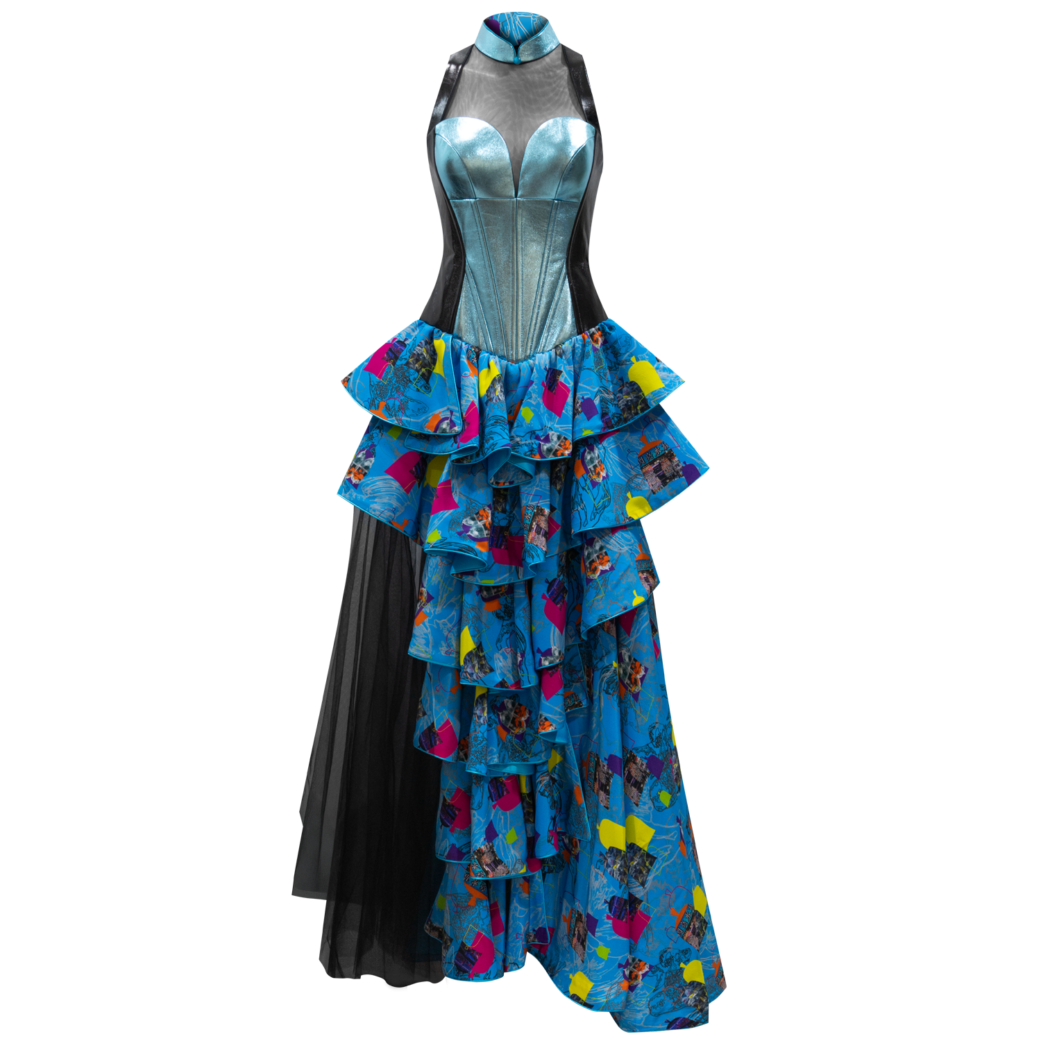 This show-stopping cheongsam party dress is fit for the red carpet! Halter neck qipao design with a sweetheart bodice in shimmery electric blue lambskin leather trimmed with black lambskin for extra effect, that opens up to an asymmetrical skirt in 【GOLDFISH STREET】silk, with a taffeta black mini-skirt underneath. The 7-layered floor length silk skirt is adorned with a long flowing sash in illusion mesh creating a goddess effect.