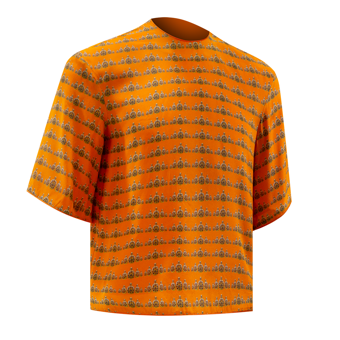 This modern silk cheongsam top in【WHITE JADE INLAY】pattern inspired by HKMoA’s priceless “Porcelain White Jade Inlaid Floral Motif” Snuff Bottle is comfortable and stylish, with a crew neck instead of the traditional mandarin collar, and mid-elbow sleeves for a contemporary look.