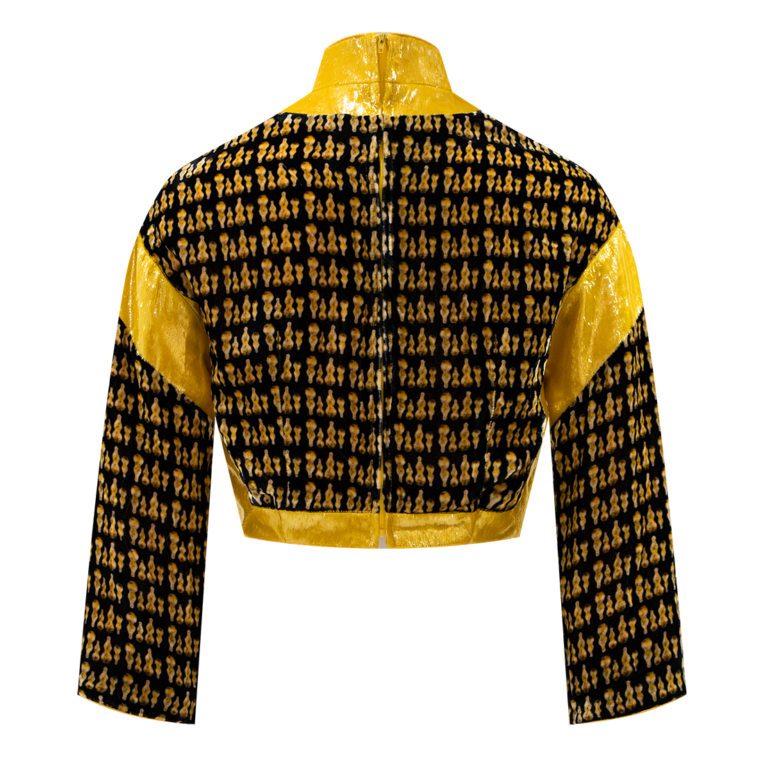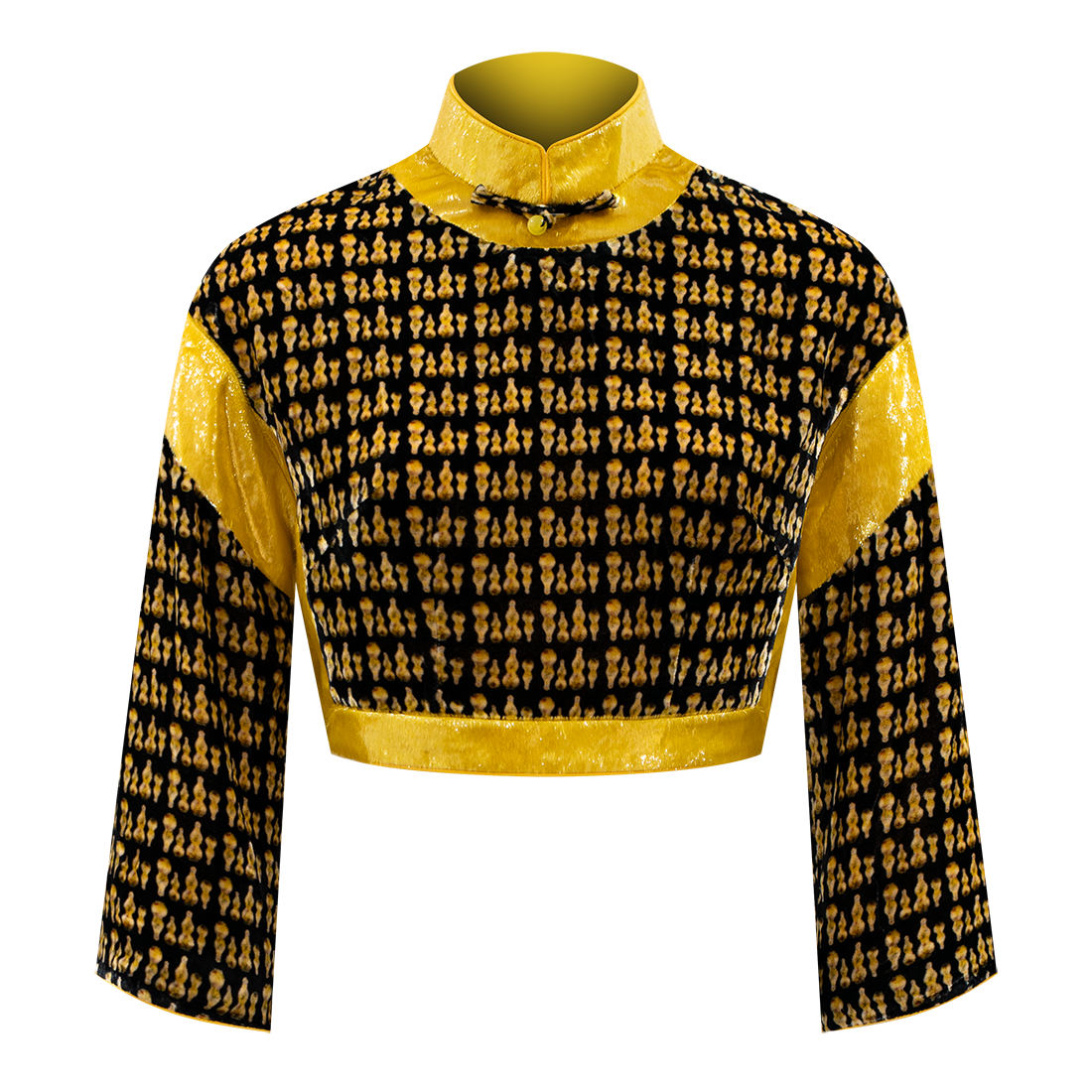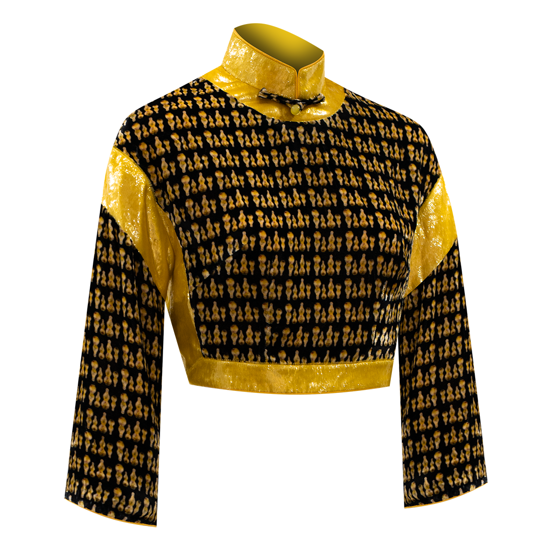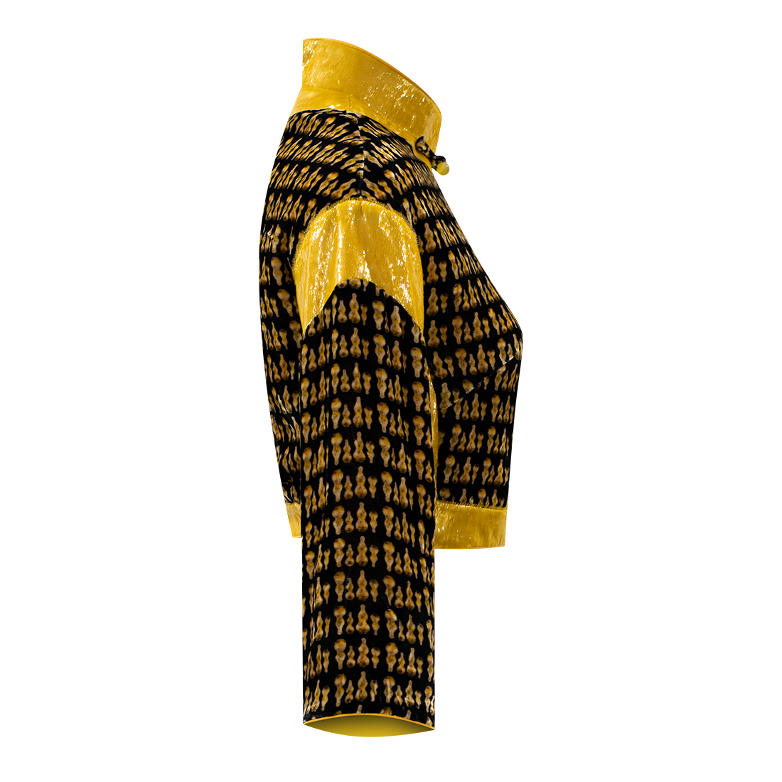 Modern and chic cropped qipao top in 【YELLOW FLORAL GOURD】patterned velvet inspired by HKMoA’s priceless Yellow Glass Painted Enamel Floral Motif Snuff Bottle. Traditional cheongsam bracelet sleeves are classic and let you show off your bracelet (hence the name), and adorned with shimmery yellow lurex mandarin collar and trims for extra texture.